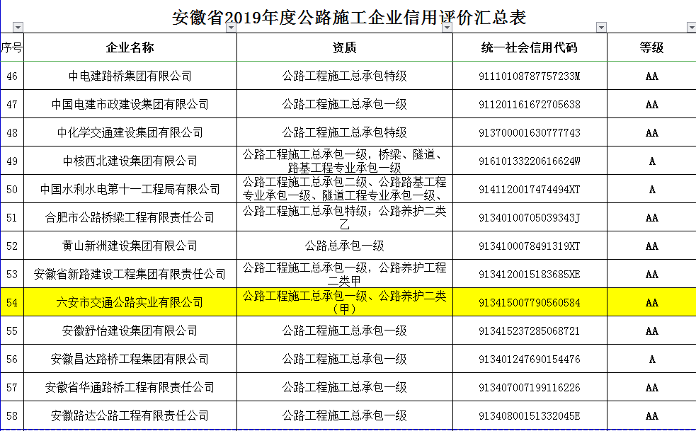 安徽省2016-2020年度安徽水運(yùn)單位信用評(píng)價(jià)-公路施工企業(yè)“AA”企業(yè)